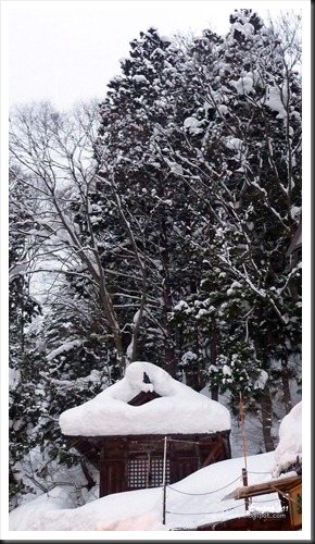 電線杆上積著雪,跟溫泉的熱氣繚繞著四周