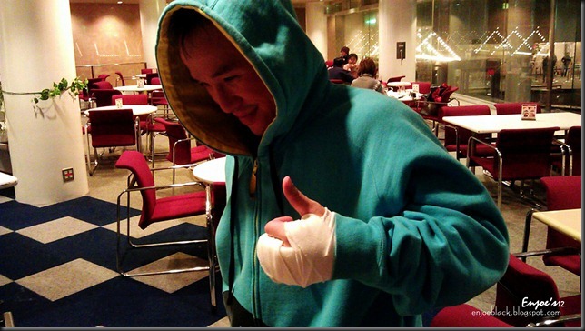 然後,運仔這個傻子昨天Night Ski的時候玩SB,結果不玩還好一玩早上先變成了白鬍子,晚上還跌倒"坐傷"了自己的手,經過一整晚的冰敷還是腫,所以早上很認真的跑去看醫生,結果照完X光後確定骨裂="=,然後就被包成這副德性……這一天,這個天才完全沒帶手套滑雪XDDD